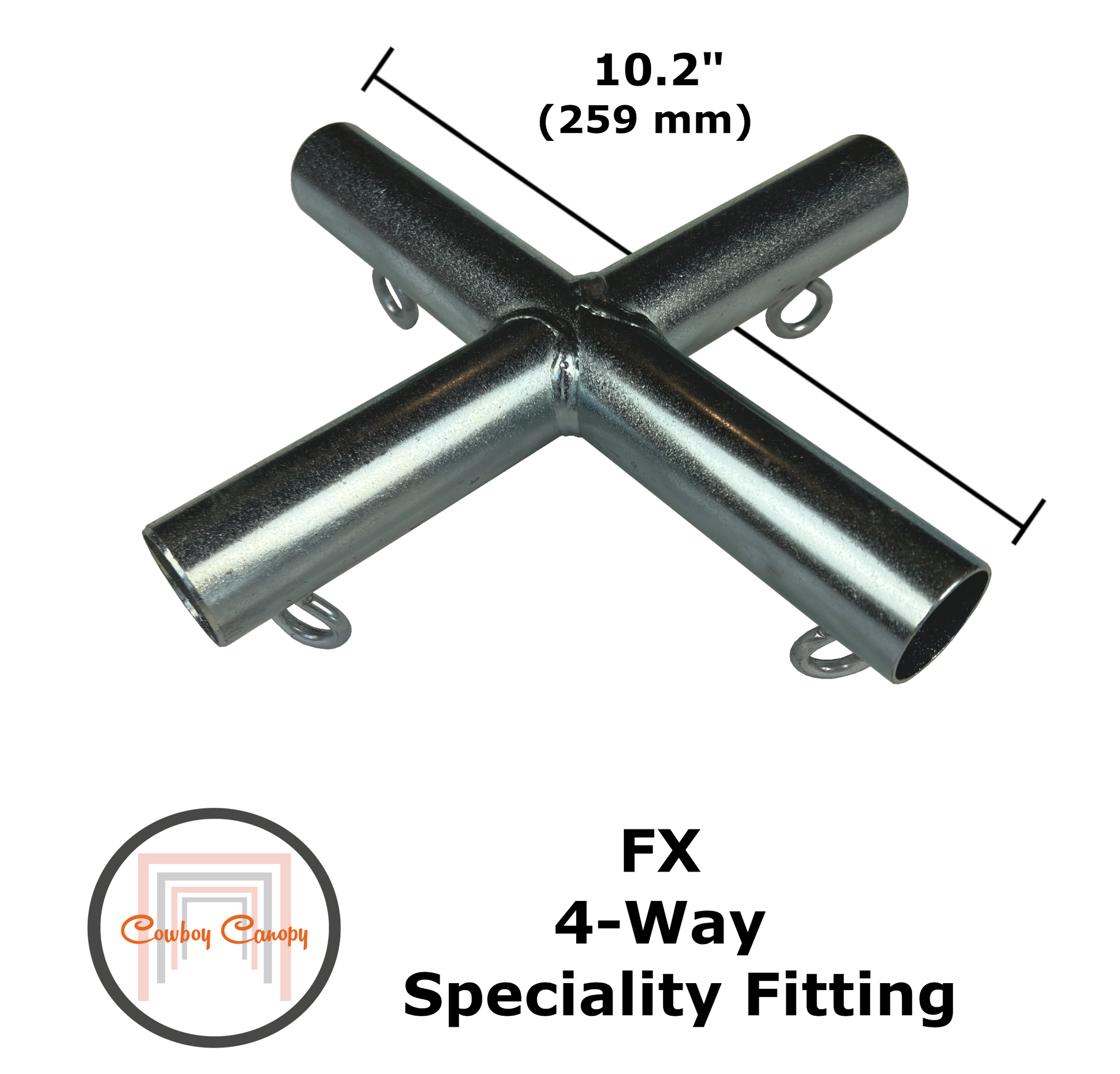 Cowboy Canopy Fittingsare premium Canopy Fittings. All Fittings have Eye Bolts, which allow for assembly without using tools. Our Fittings are made of strong, 15-Gauge galvanized steel. The galvanized steel is rust resistant and long-lasting. The welded joints are solid and capable of maintaining integrity under stress. Even the Eye Bolt nuts have 360-degree welds (no tack welds). Cowboy Canopy Fittings will provide you with decades of use.