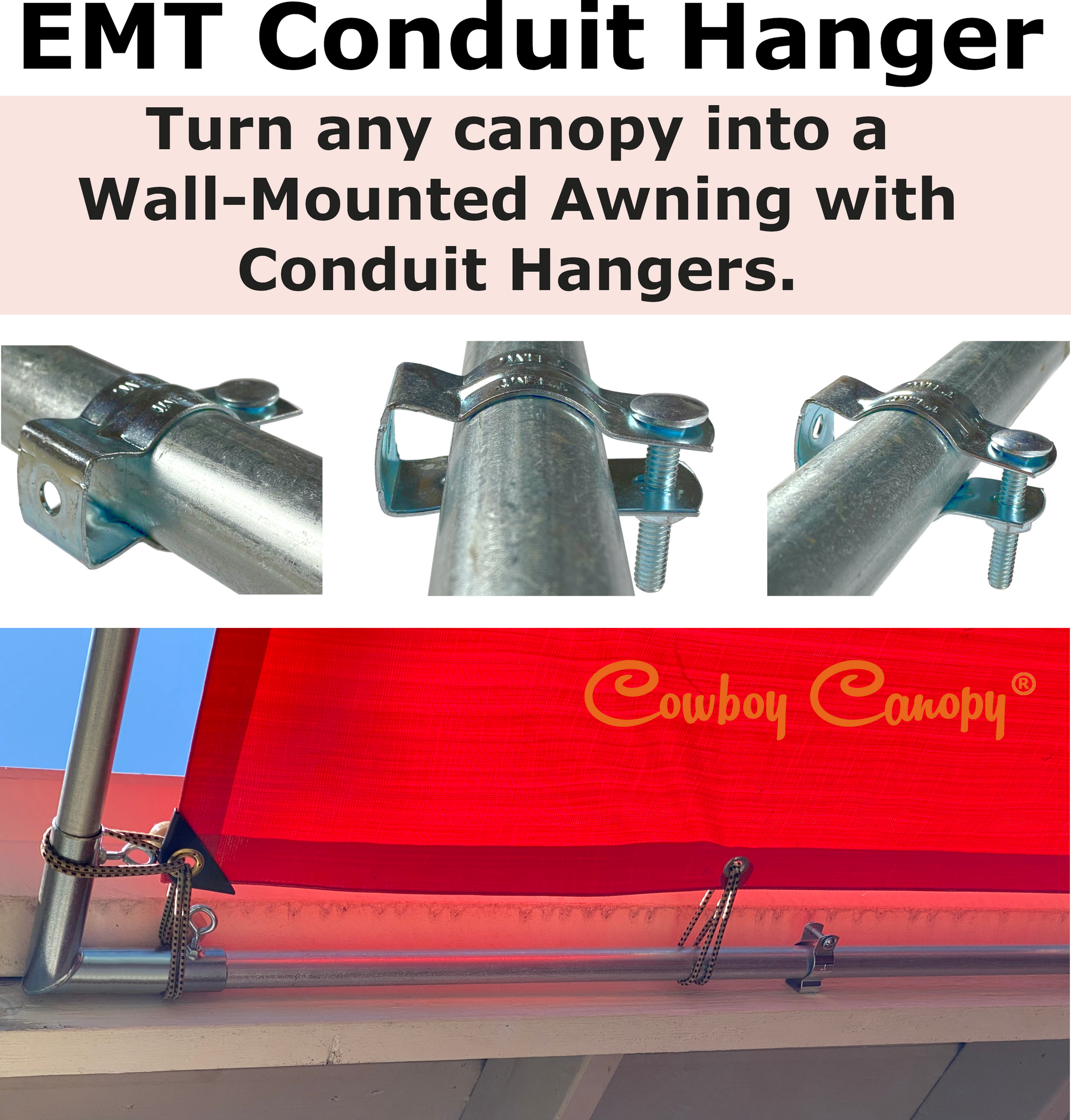 3/4" Wall-Mounted Flat Awning Kits come complete with all roof fittings and EMT conduit hangers to attach/hang a flat awning to another building. 4 conduit hangers are included for every 10 feet of awning length.