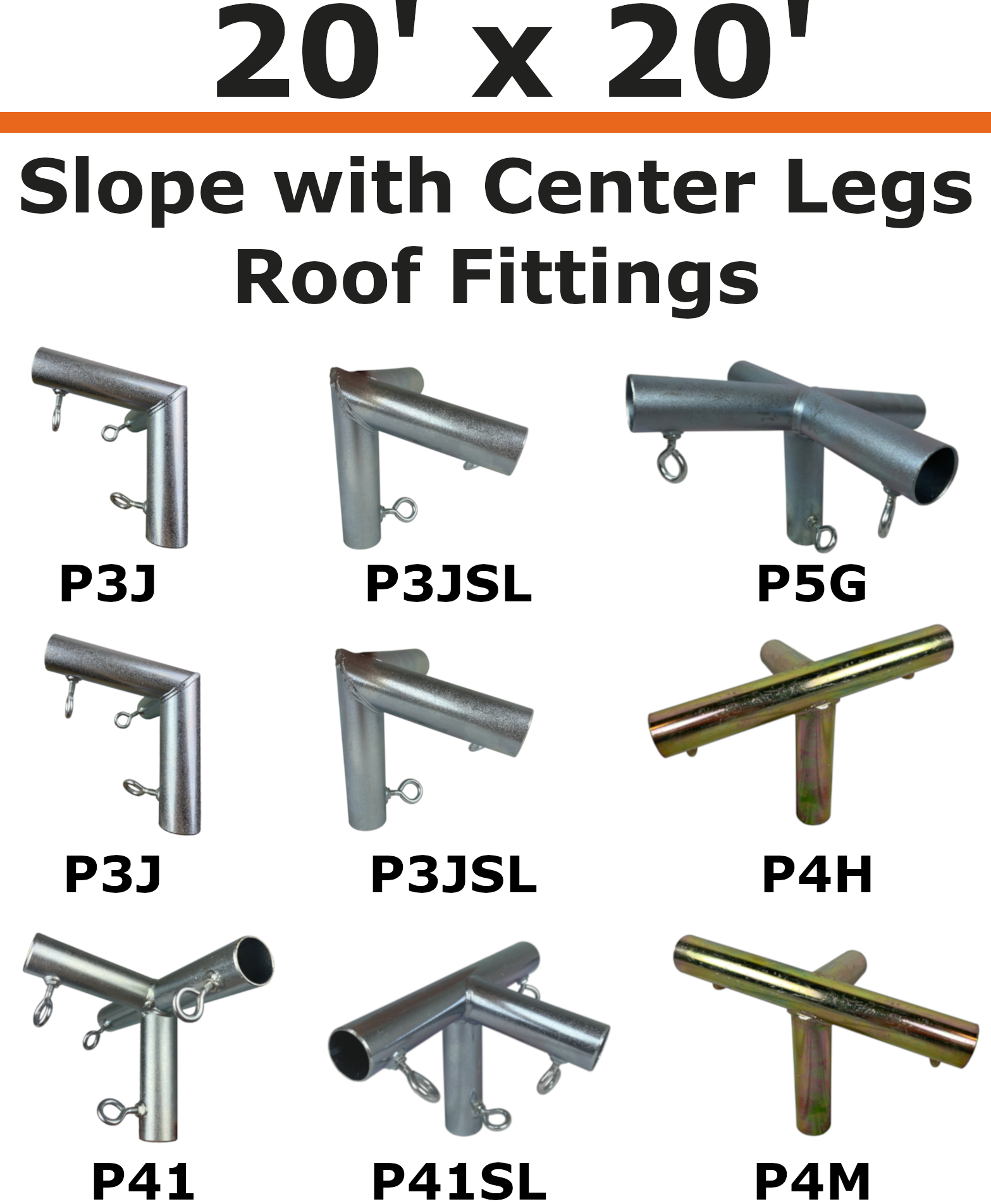 3/4" Slope with Center Legs Canopy Kits come complete with all roof fittings to build a 20' wide slope canopy. Slope roof fittings have a 102-degree angle with a roof pitch of 2.5" of rise per foot of run. Custom options include size, foot pads, and side wall fittings. Instructions for assembly are included with all canopy kits.