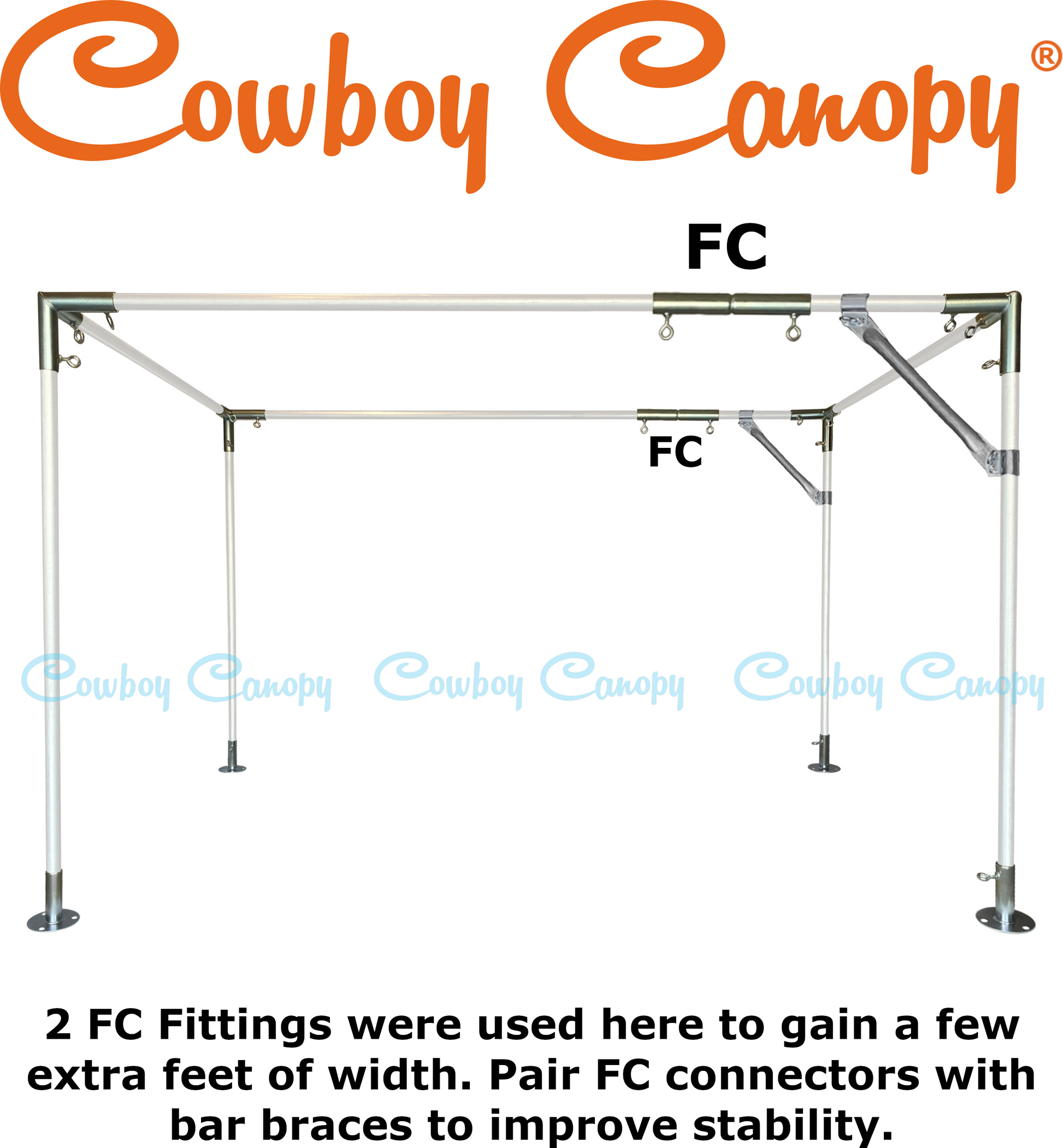 Cowboy Canopy Fittingsare premium Canopy Fittings. All Fittings have Eye Bolts, which allow for assembly without using tools. Our Fittings are made of strong, 15-Gauge galvanized steel. The galvanized steel is rust resistant and long-lasting. The welded joints are solid and capable of maintaining integrity under stress. Even the Eye Bolt nuts have 360-degree welds (no tack welds). Cowboy Canopy Fittings will provide you with decades of use.