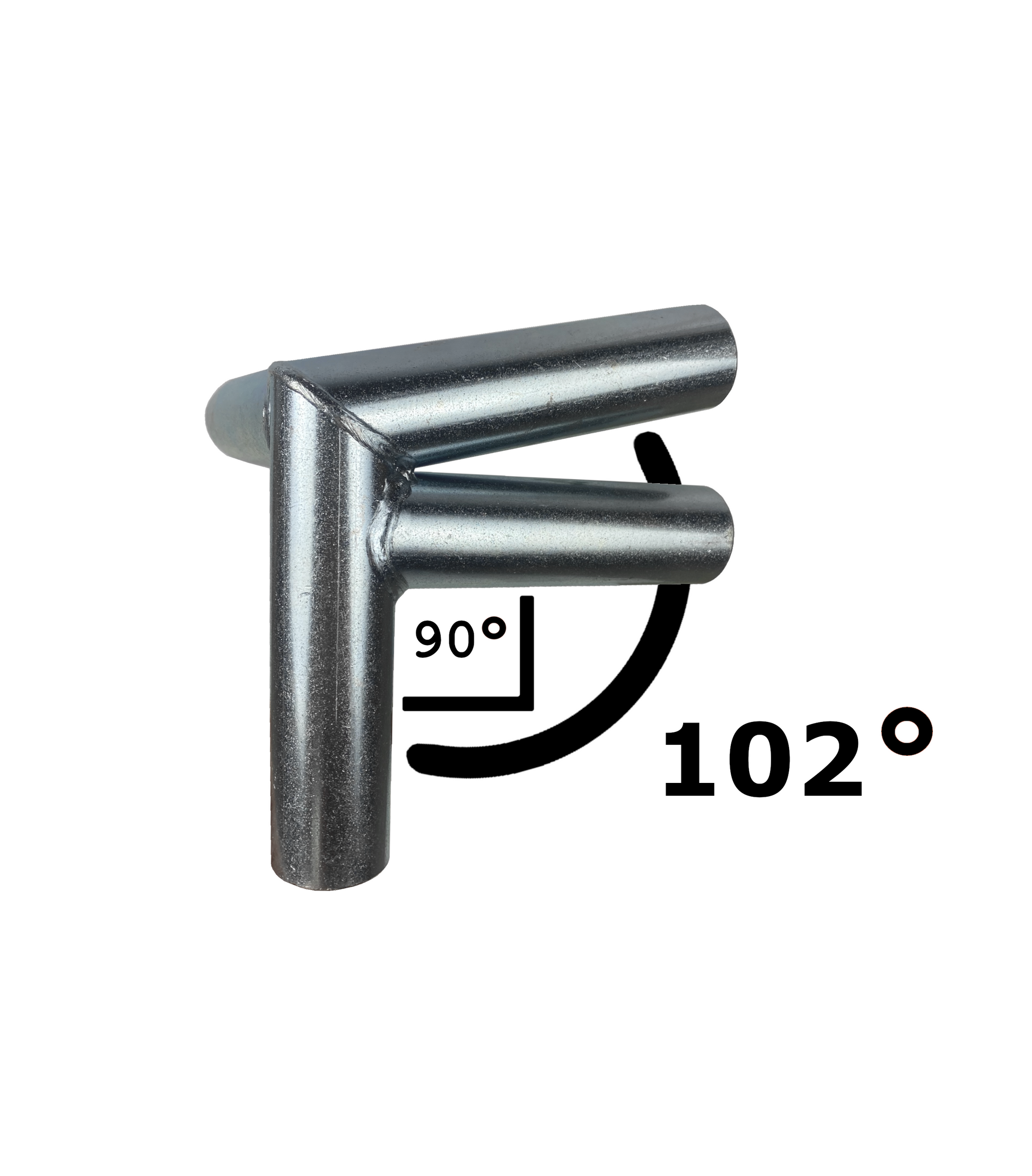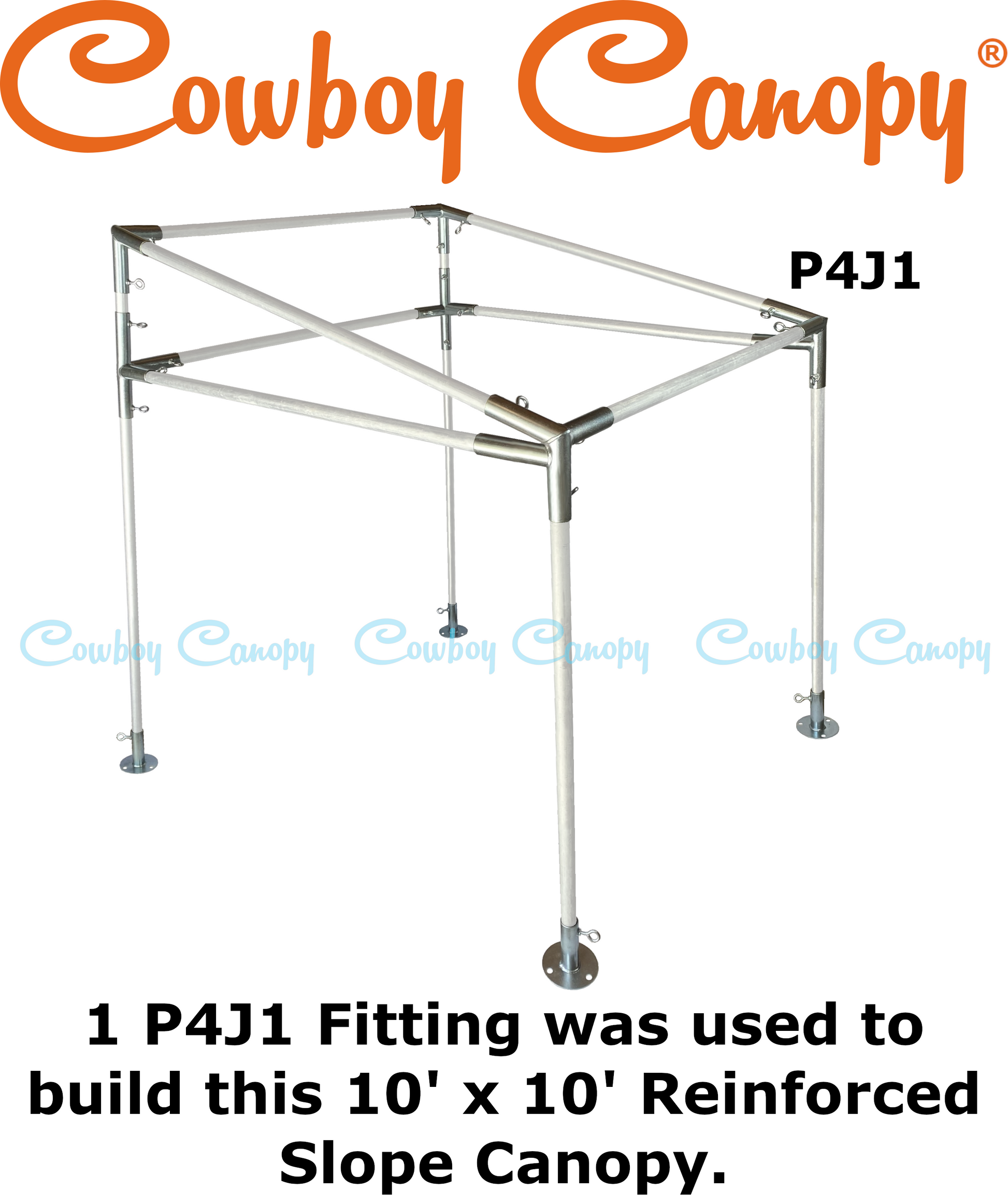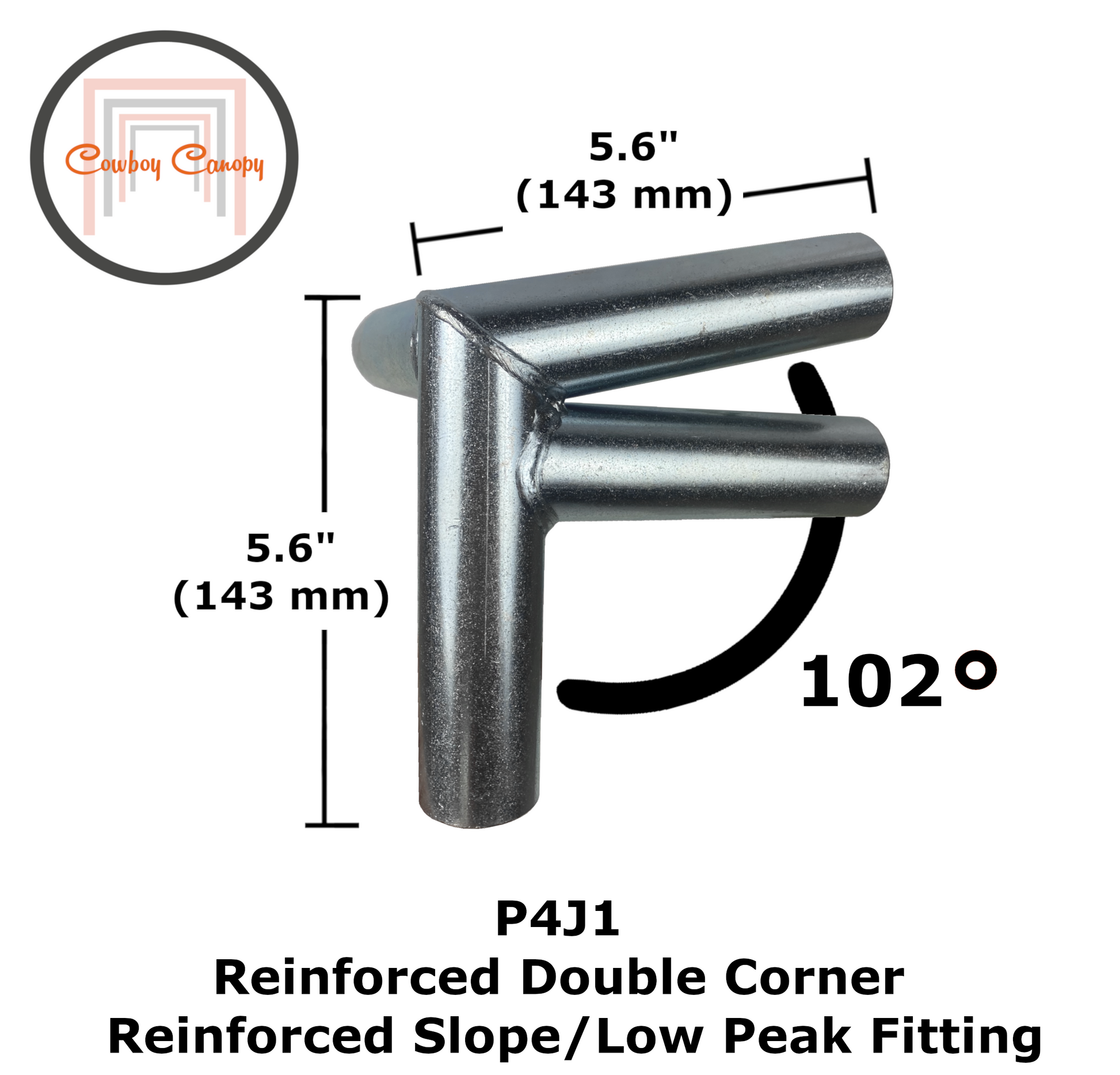 P4J1 Fittings are reinforced, 4-Way Fittings used to build reinforced slope and reinforced low peak canopies with roof pitches of 102-degrees. A 102-degree roof pitch has 2.5 inches of rise for every foot of run.