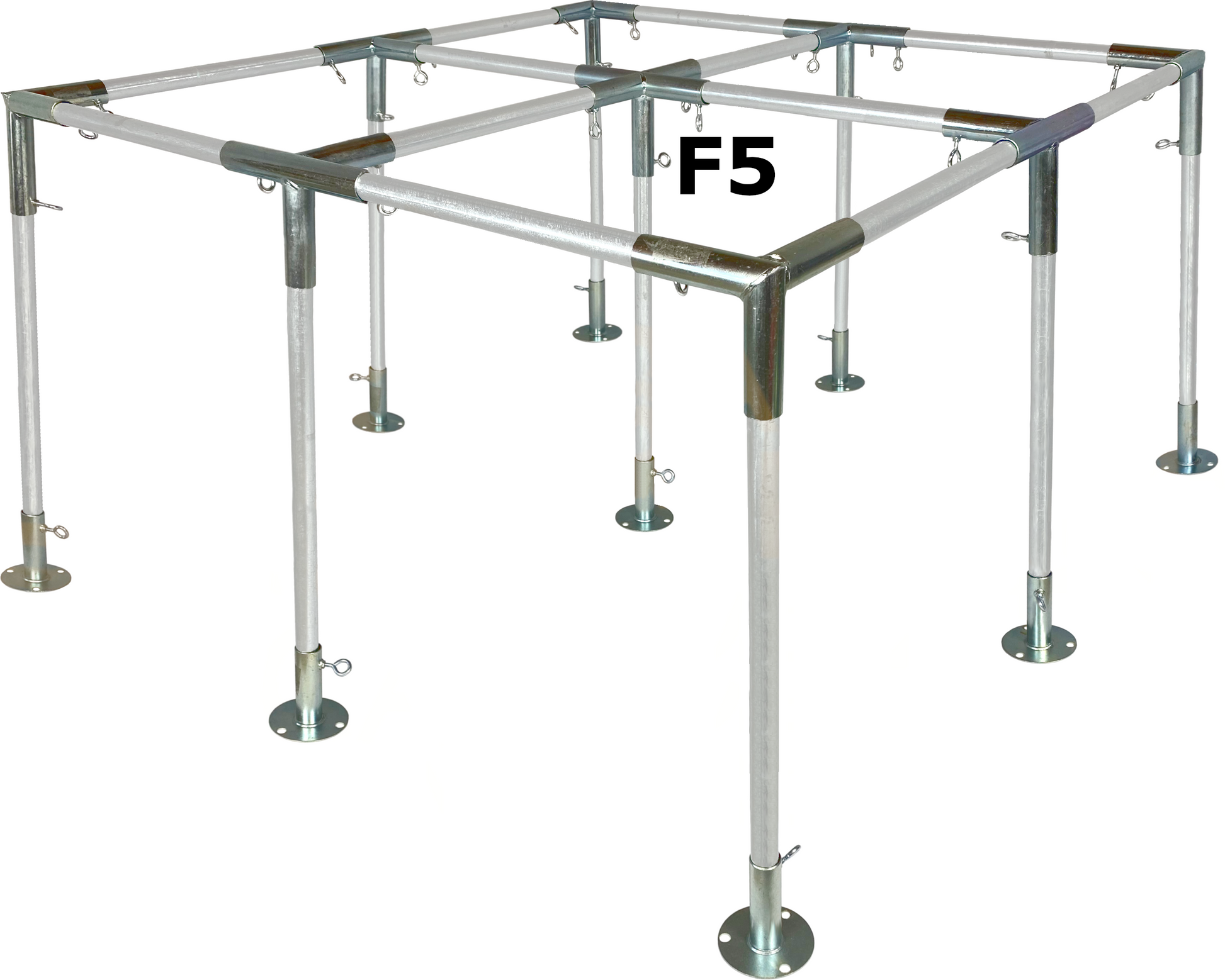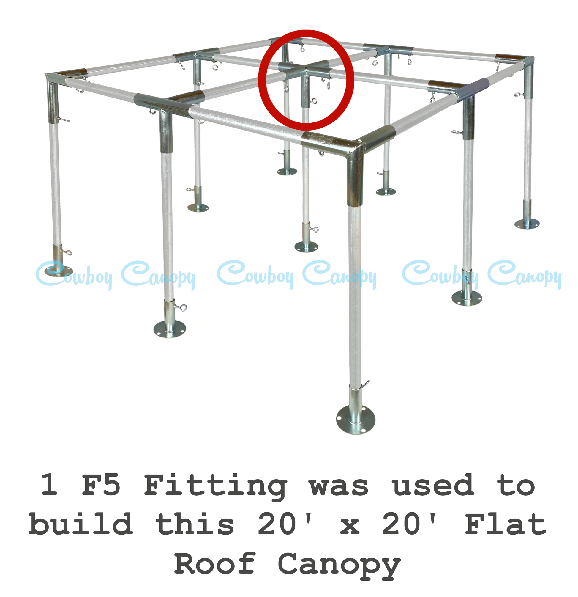 F5 Fittings are 5-Way Peak Fittings used to build large flat roof canopies with center legs.