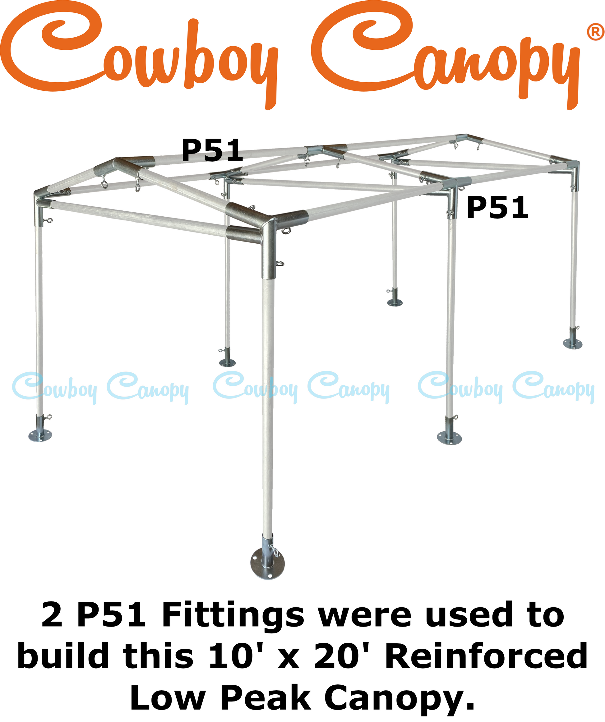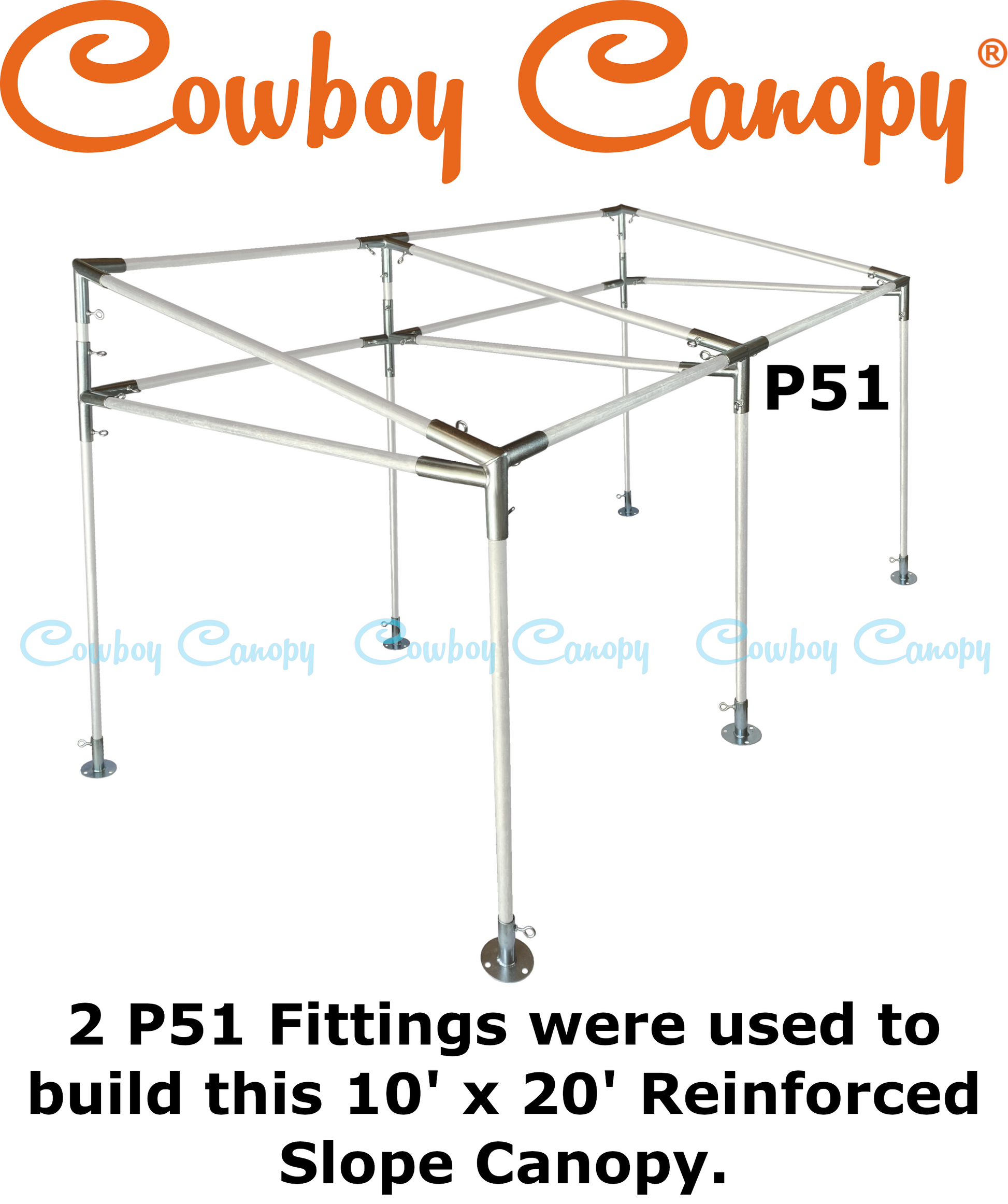 Cowboy Canopy Fittings are premium Canopy Fittings. All Fittings have Eye Bolts, which allow for assembly without using tools. Our Fittings are made of strong, 15-Gauge galvanized steel. The galvanized steel is rust resistant and long-lasting. The welded joints are solid and capable of maintaining integrity under stress. Even the Eye Bolt nuts have 360-degree welds (no tack welds). Cowboy Canopy Fittings will provide you with decades of use.